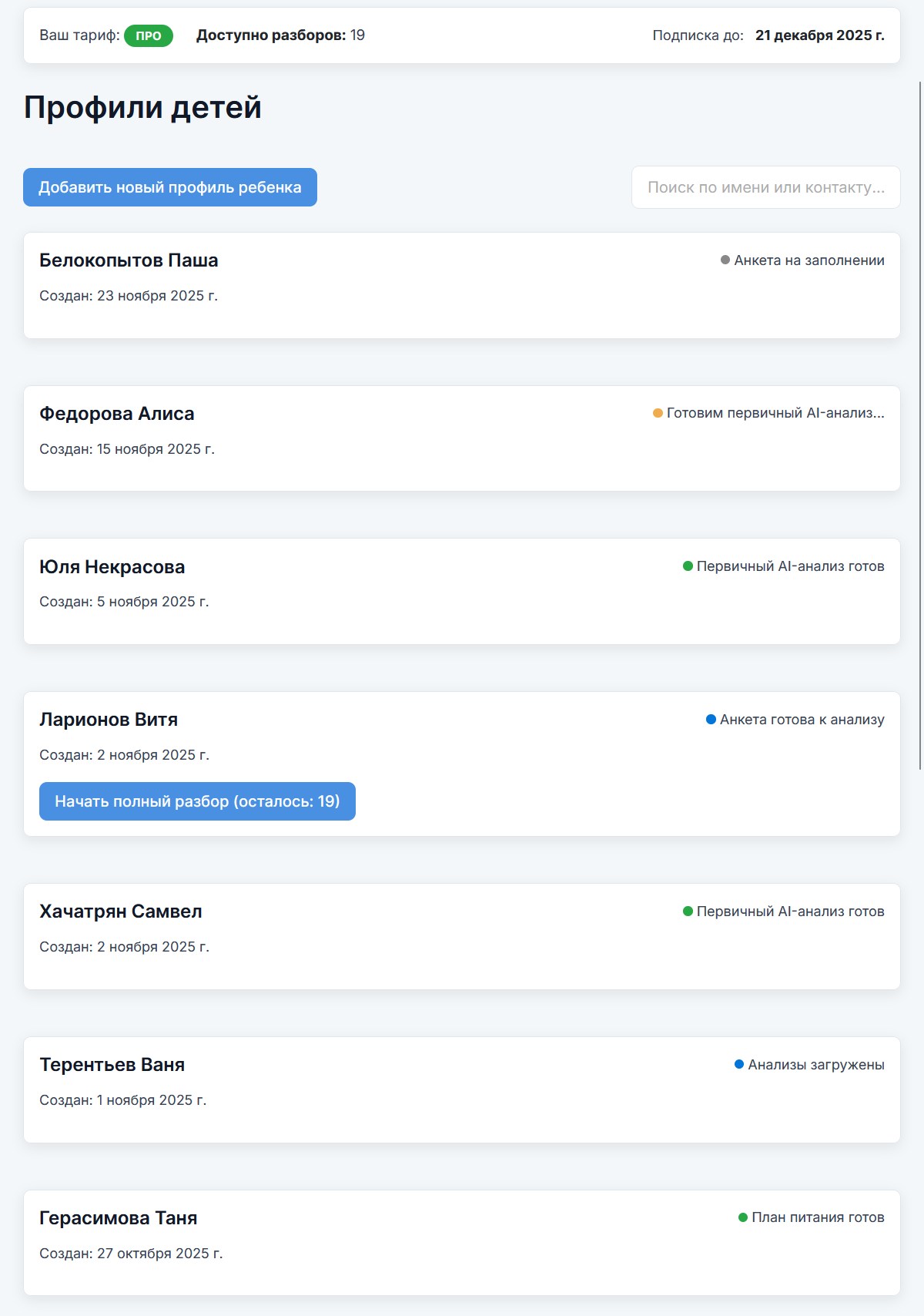 Наш “второй мозг” для детских нутрициологов и педиатров анализирует анкеты, дневники питания и анализы, чтобы вы могли сфокусироваться на главном — помощи вашим маленьким клиентам.