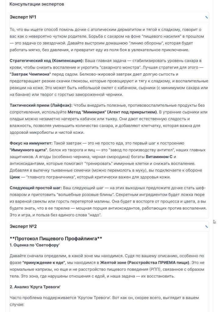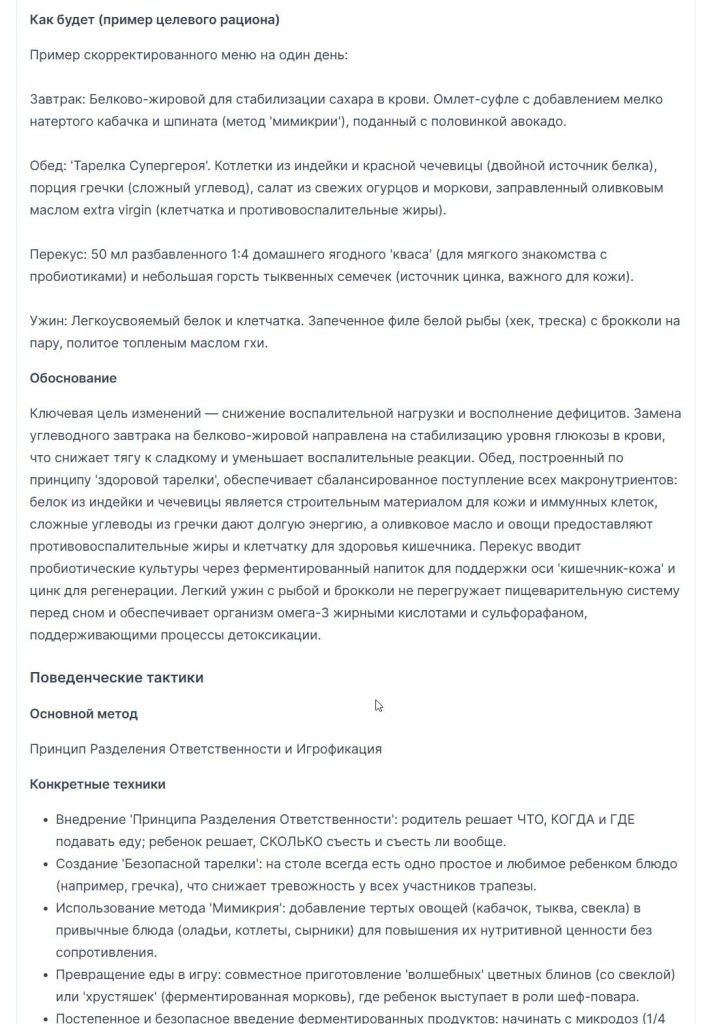 Психологическая поддержка и обучение. Отчет включает не только рецепты, но и конкретные скрипты для родителей: как убрать “пищевое насилие”, как внедрить “Метод Мимикрии” и превратить еду в игру.