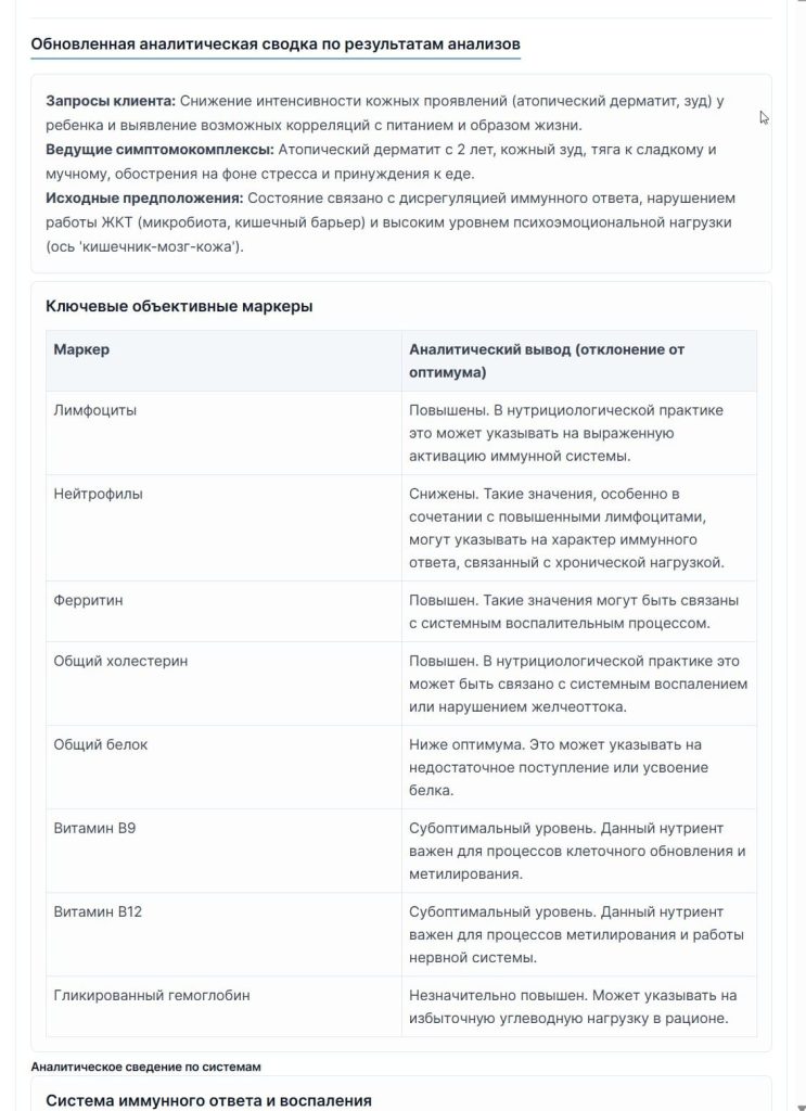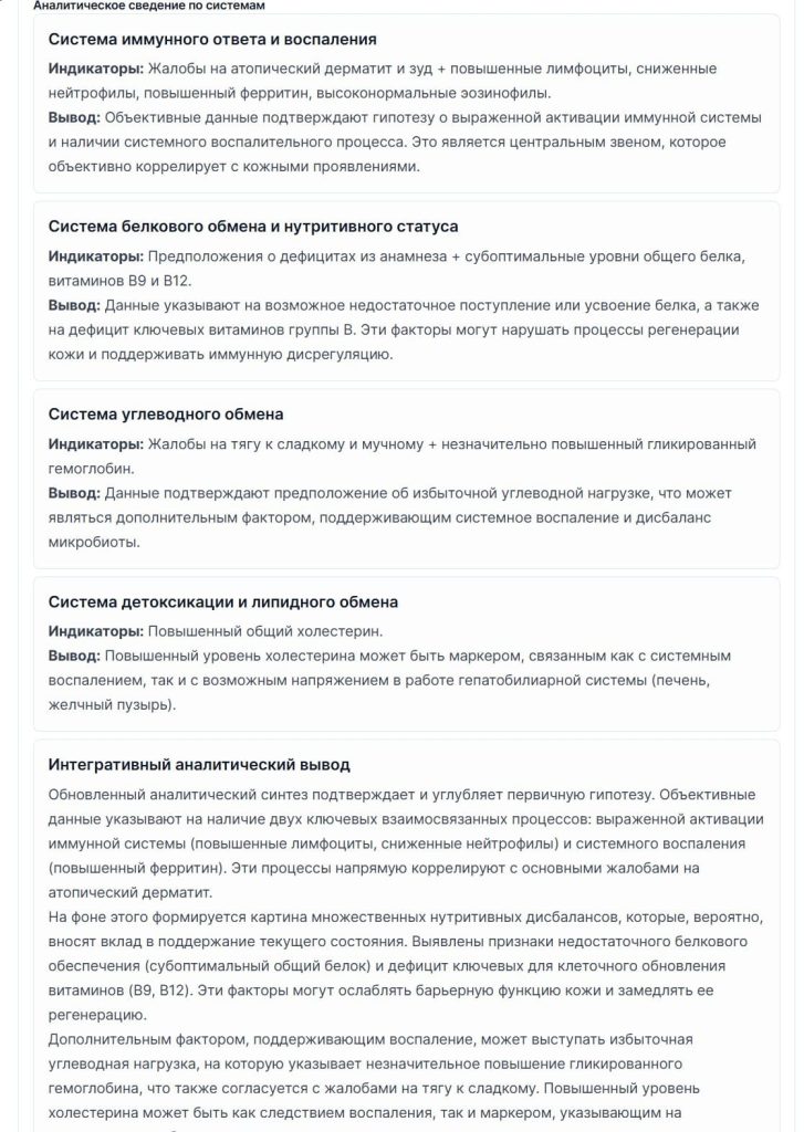 Системная аналитическая конвергенция. ИИ группирует разрозненные данные по физиологическим системам. Он наглядно показывает, как субъективные жалобы клиента подтверждаются объективными цифрами из анализов