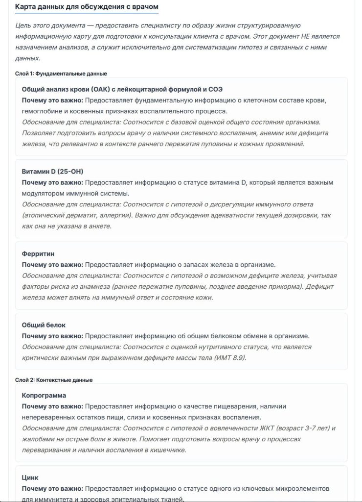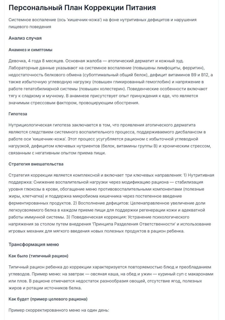 Логичная и понятная структура. Отчет уже разбит на разделы: “Обновленное заключение”, “План питания”, “Рекомендации”. Все четко и по делу.